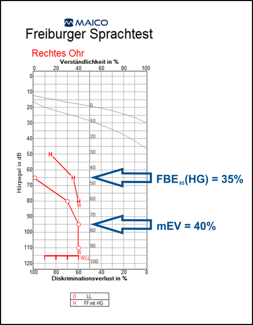 - Die unversorgt und über Kopfhörer gemessene maximale Einsilber-Verständlichkeit in Ruhe (mEV)